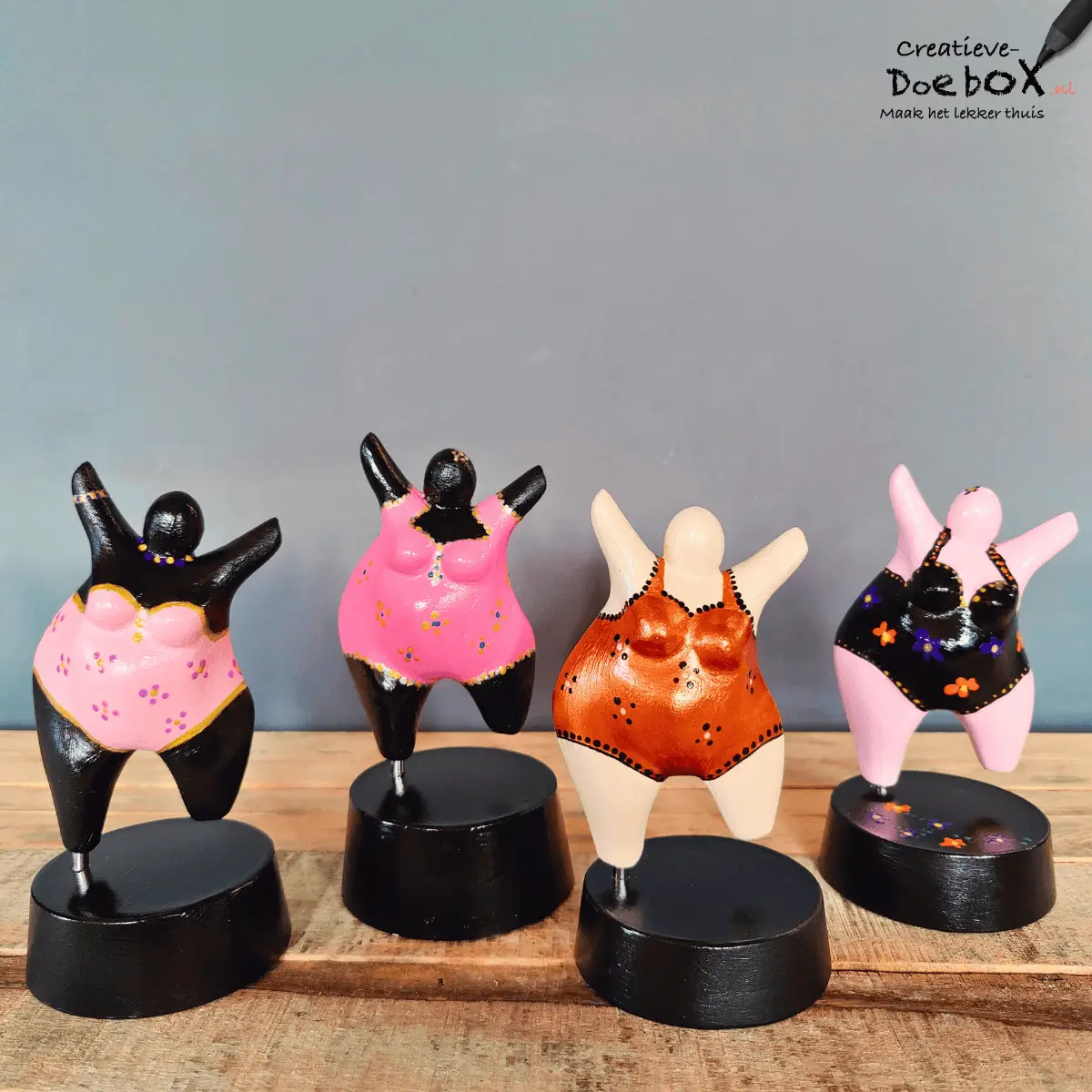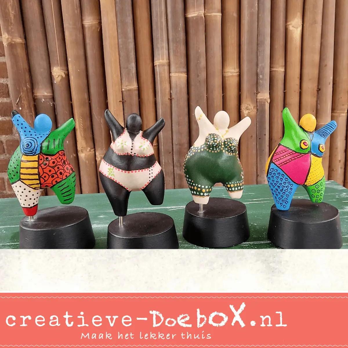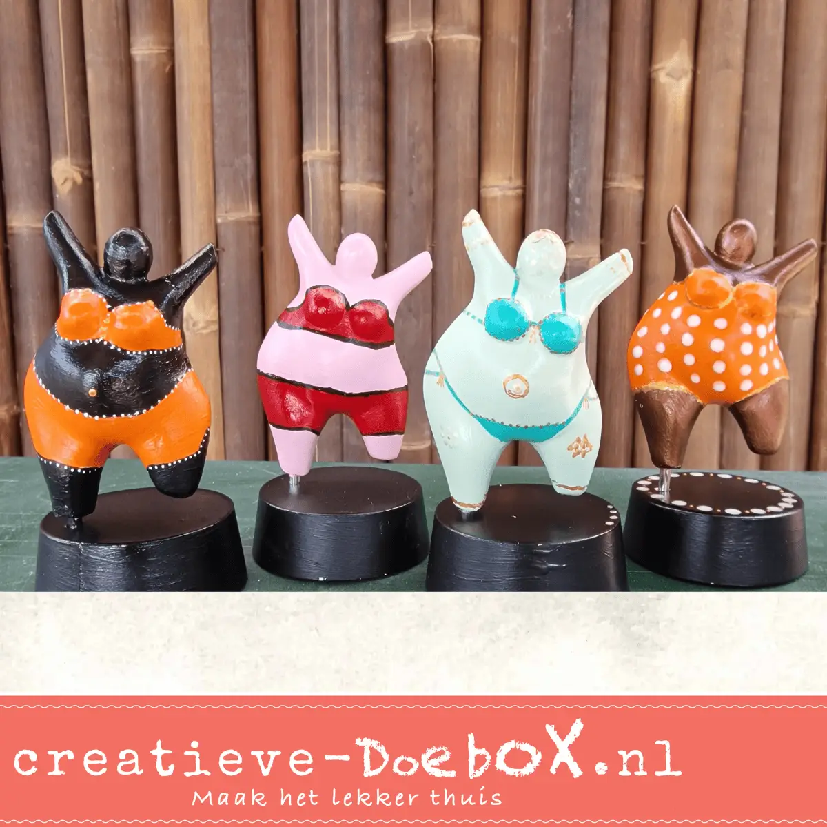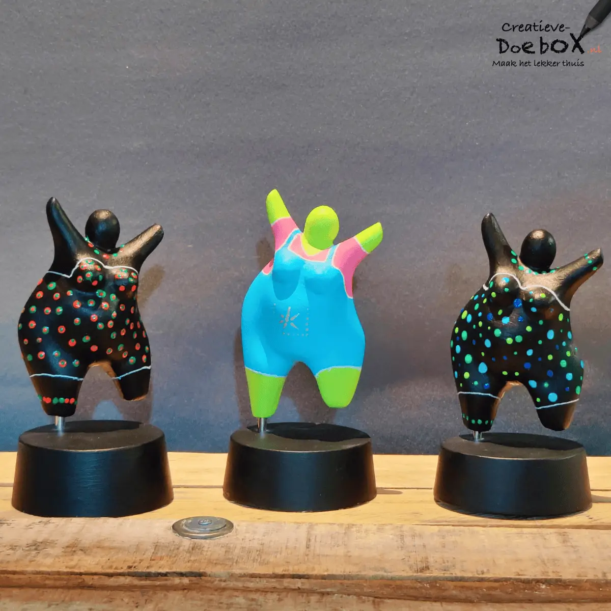 Je kunt de dikke dames beeldjes hier los bestellen. Ieder beeldje heb ik al voorzien van een gesso laagje en op het sokkeltje heb ik een zwarte basislaag gezet. Uiteraard kun je het sokkeltje nog overschilderen in een andere kleur. Op deze Nana kun je direct gaan schilderen, het leuke werk. Een beeldje is ongeveer 15 cm.