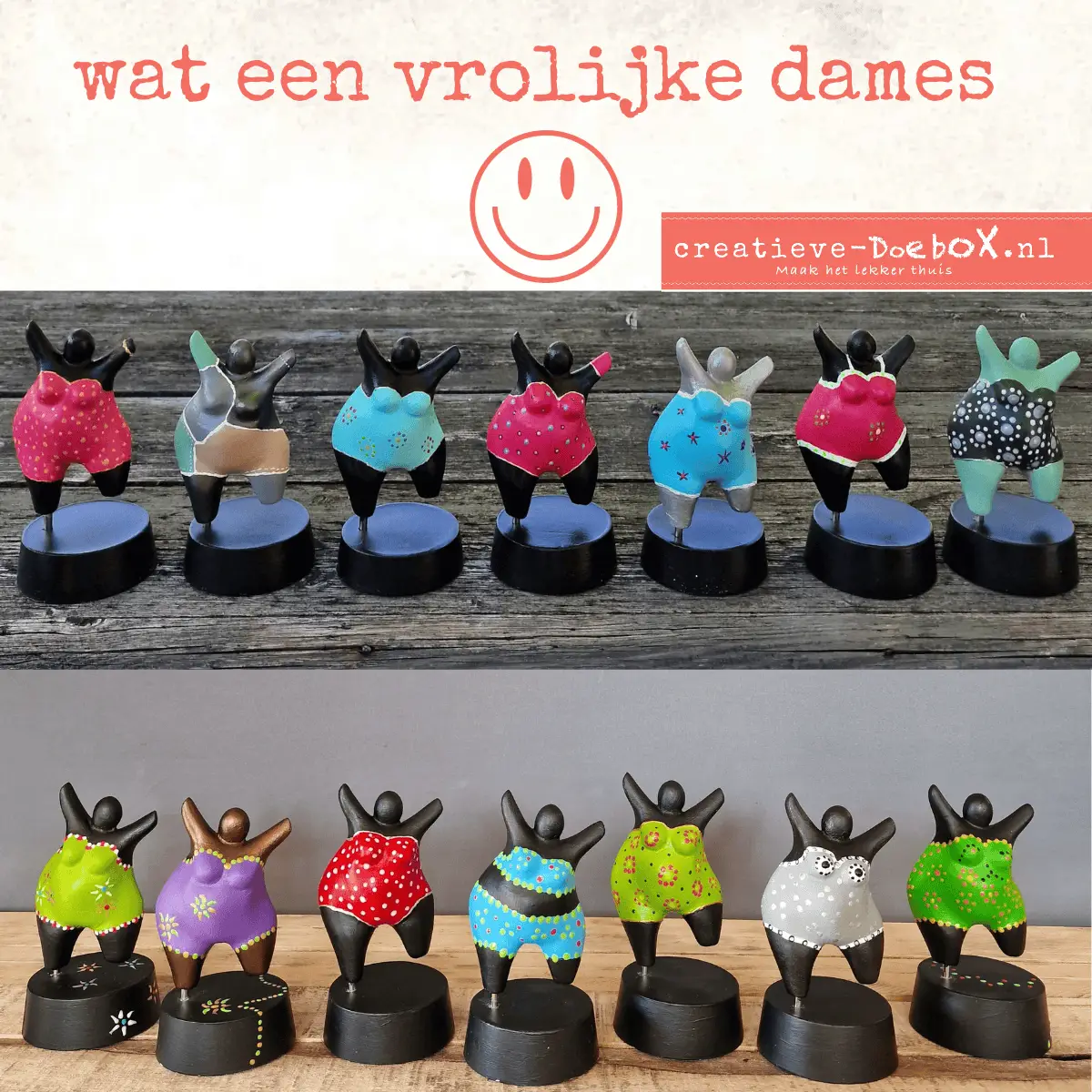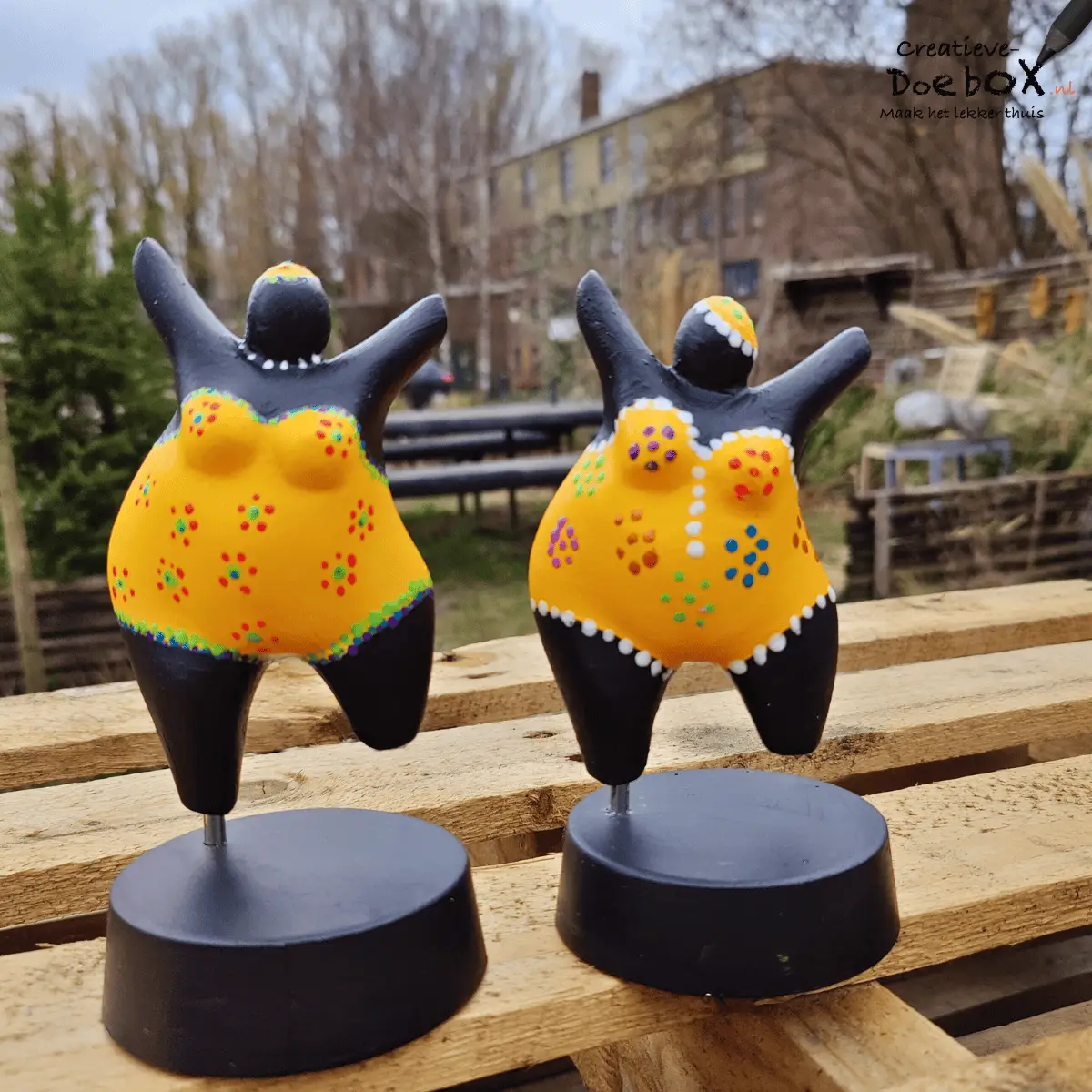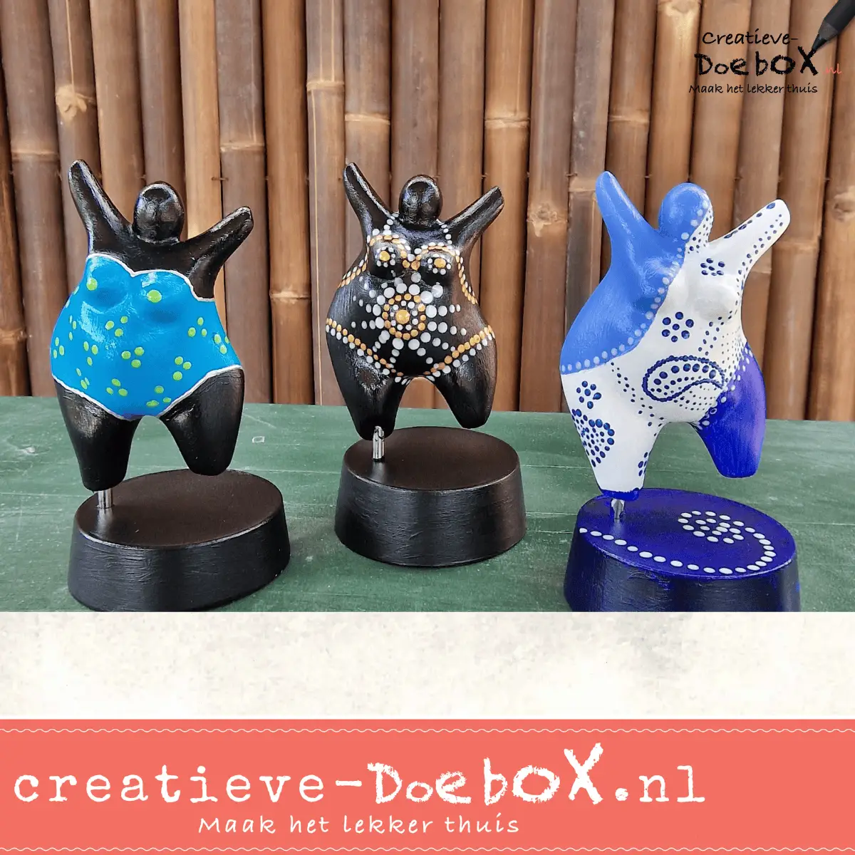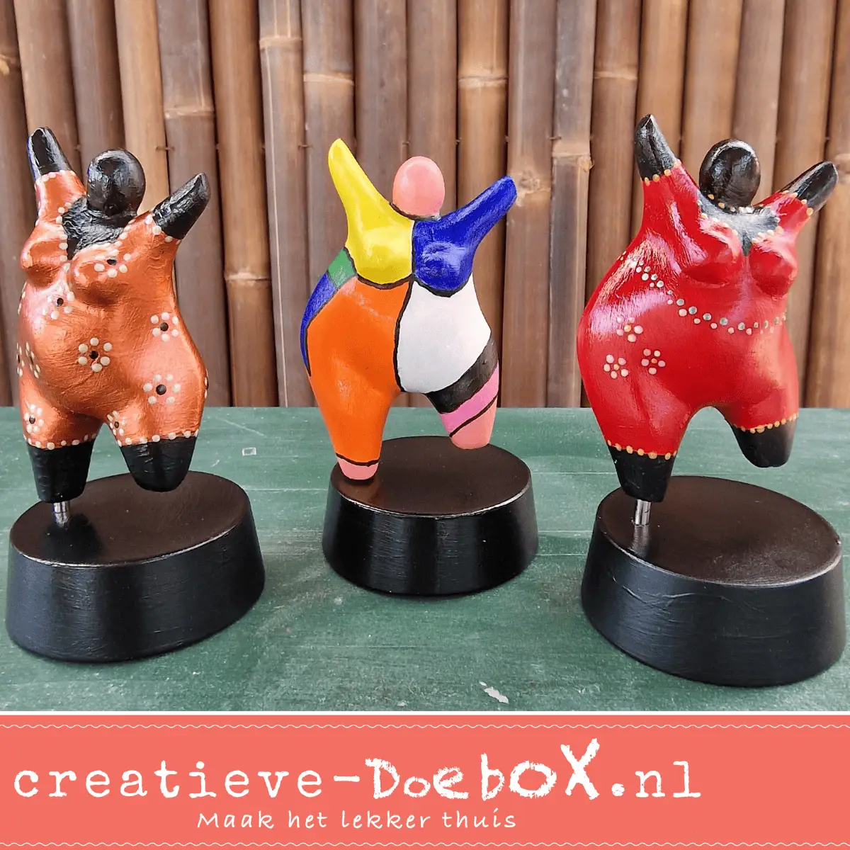 Je kunt de dikke dames beeldjes hier los bestellen. Ieder beeldje heb ik al voorzien van een gesso laagje en op het sokkeltje heb ik een zwarte basislaag gezet. Uiteraard kun je het sokkeltje nog overschilderen in een andere kleur. Op deze Nana kun je direct gaan schilderen, het leuke werk. Een beeldje is ongeveer 15 cm.