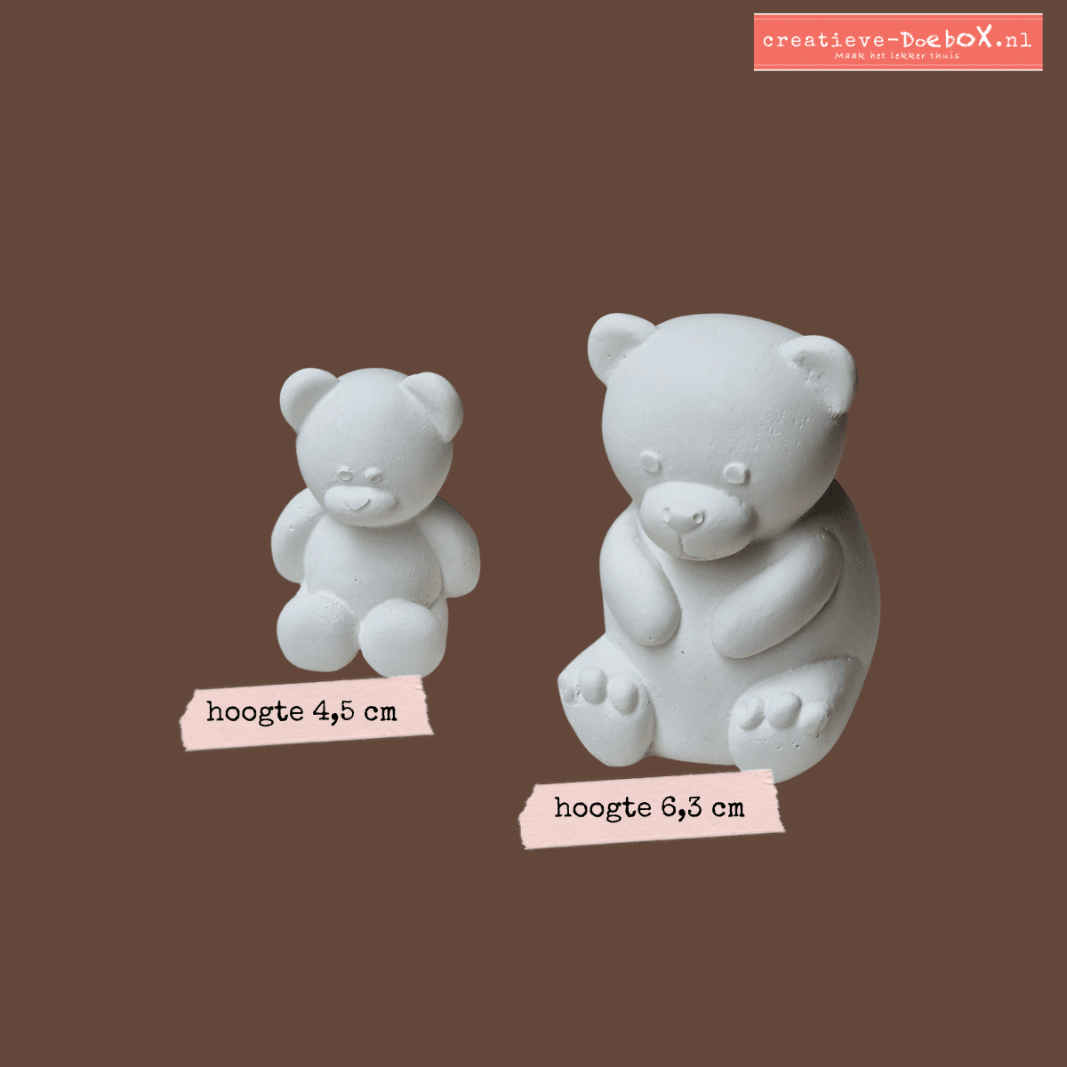 Deze twee schattige beertjes stelen meteen je hart! Met hun lieve uitstraling zijn ze perfect als klein detail op een kinderkamer of als ornamentje bij een babyfoto. De ene is 4,5 cm hoog, de andere 6,3 cm – een schattig duo om te beschilderen in zachte pasteltinten of juist lekker speels en kleurrijk.