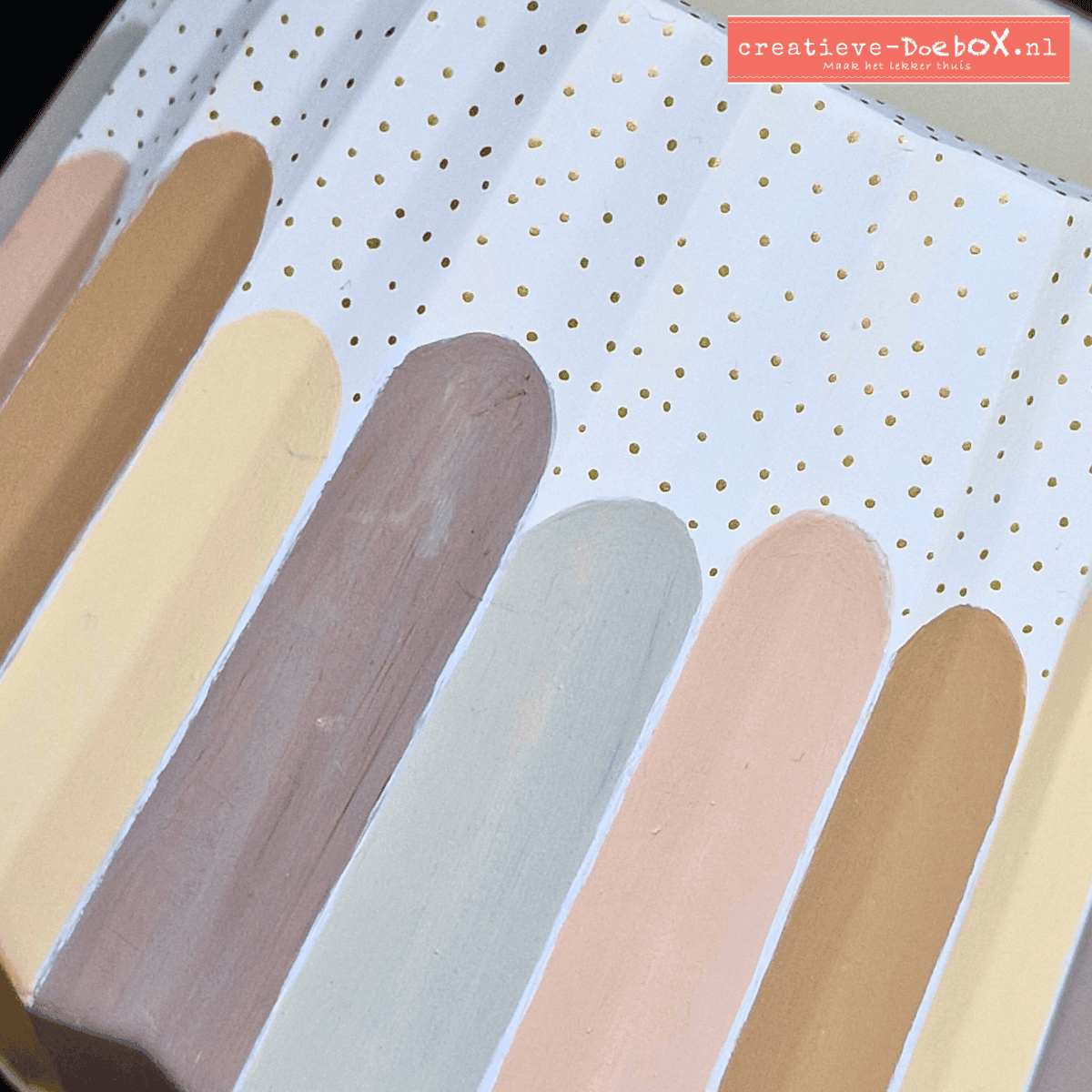 Op mijn voorbeelden heb ik ook gewerkt met acrylstiften, waarmee je strakke lijnen, patronen of ministipjes kunt toevoegen. Echt ideaal voor fijne details! Wil jij dit ook? Acrylstiften en penselen bestel je eenvoudig als optie op deze pagina.