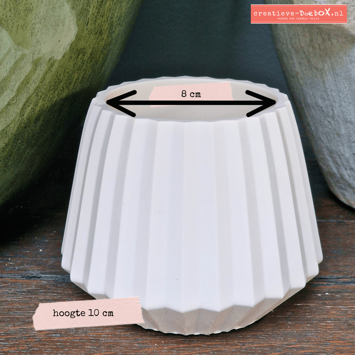De bloempot heeft een hoogte van 10 cm en een bovenste opening van 8 cm. Wil je er een plantje in zetten? Dan raad ik aan om het plantje in een dubbele laag plastic in te doen. Keramisch gips is een decoratief materiaal en niet waterdicht, dus wees voorzichtig met water geven. Een plant krijgt snel teveel en ik kan het weten met mijn bloemistenachtergrond.