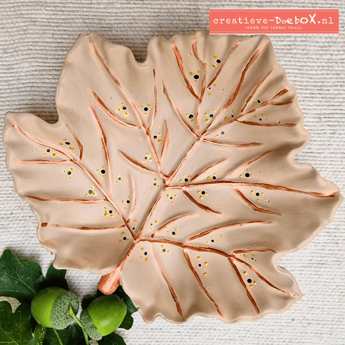 Haal de prachtige herfstkleuren in huis met dit elegante schaaltje in de vorm van een esdoornblad. Met een formaat van 13 x 15 x 3 cm is dit schaaltje ideaal om te gebruiken als decoratief object. Het natuurlijke ontwerp voegt een vleugje herfst toe aan elke ruimte. Of je nu kiest om het te beschilderen of in zijn originele staat laat, dit schaaltje zal zeker opvallen.