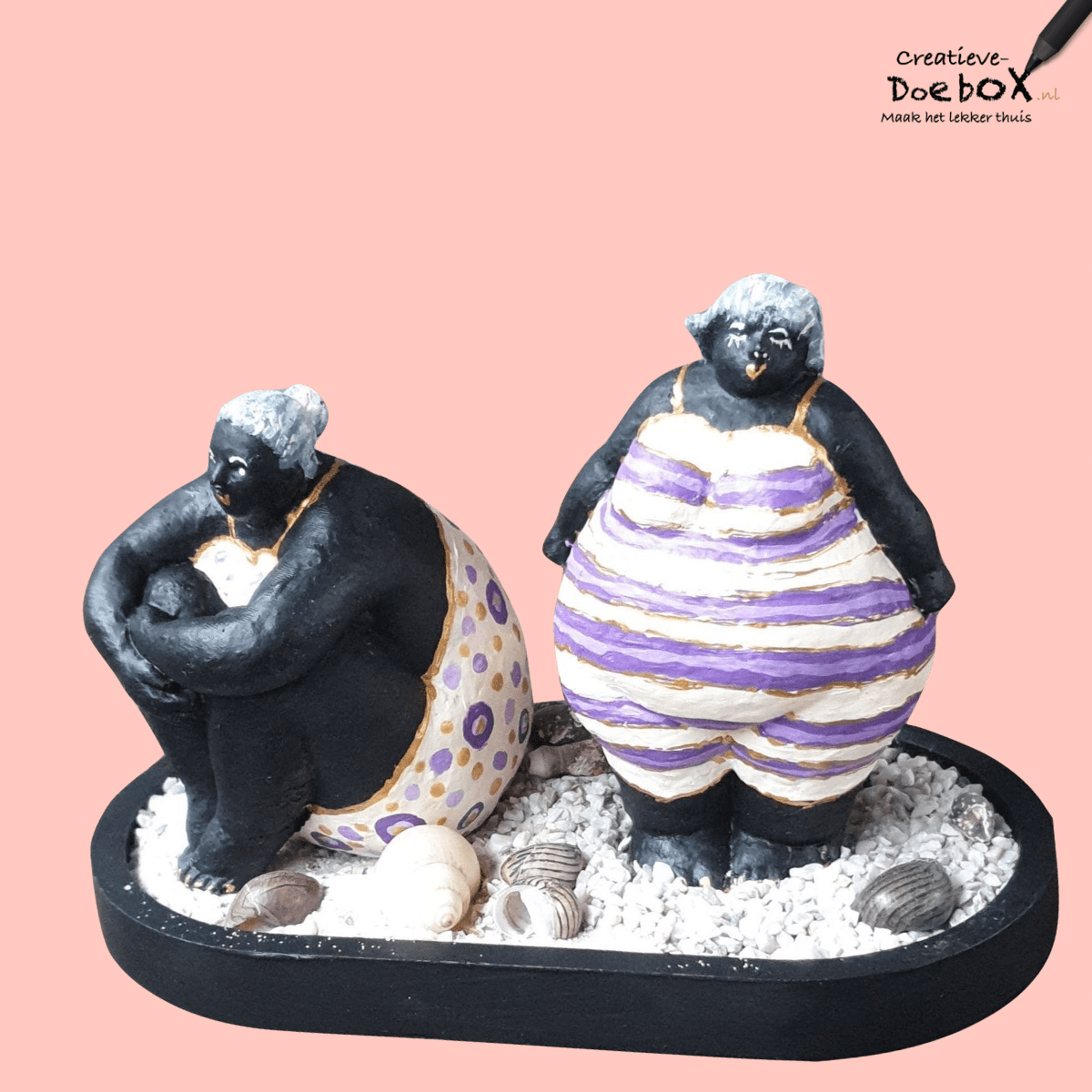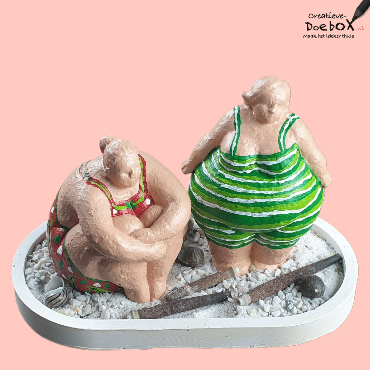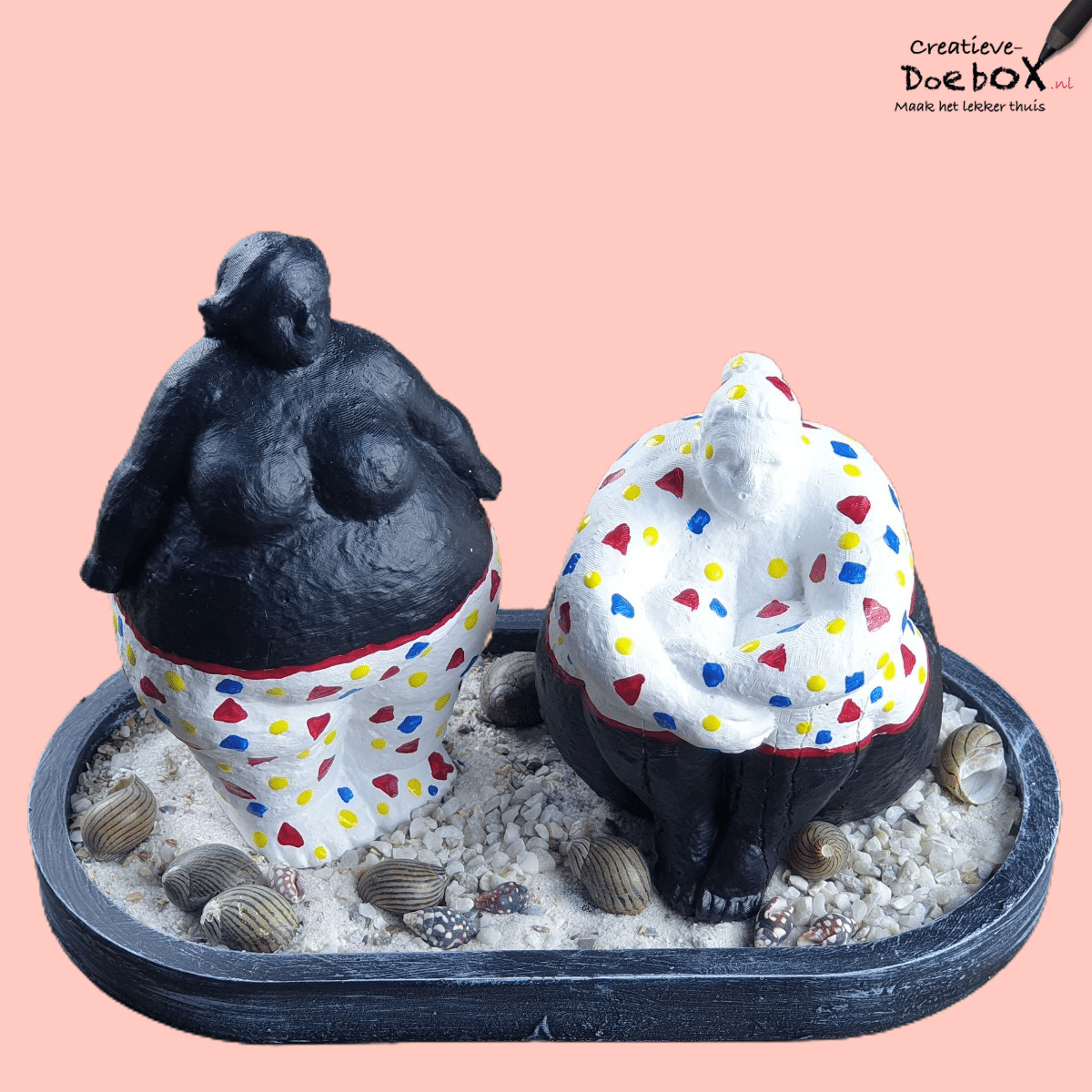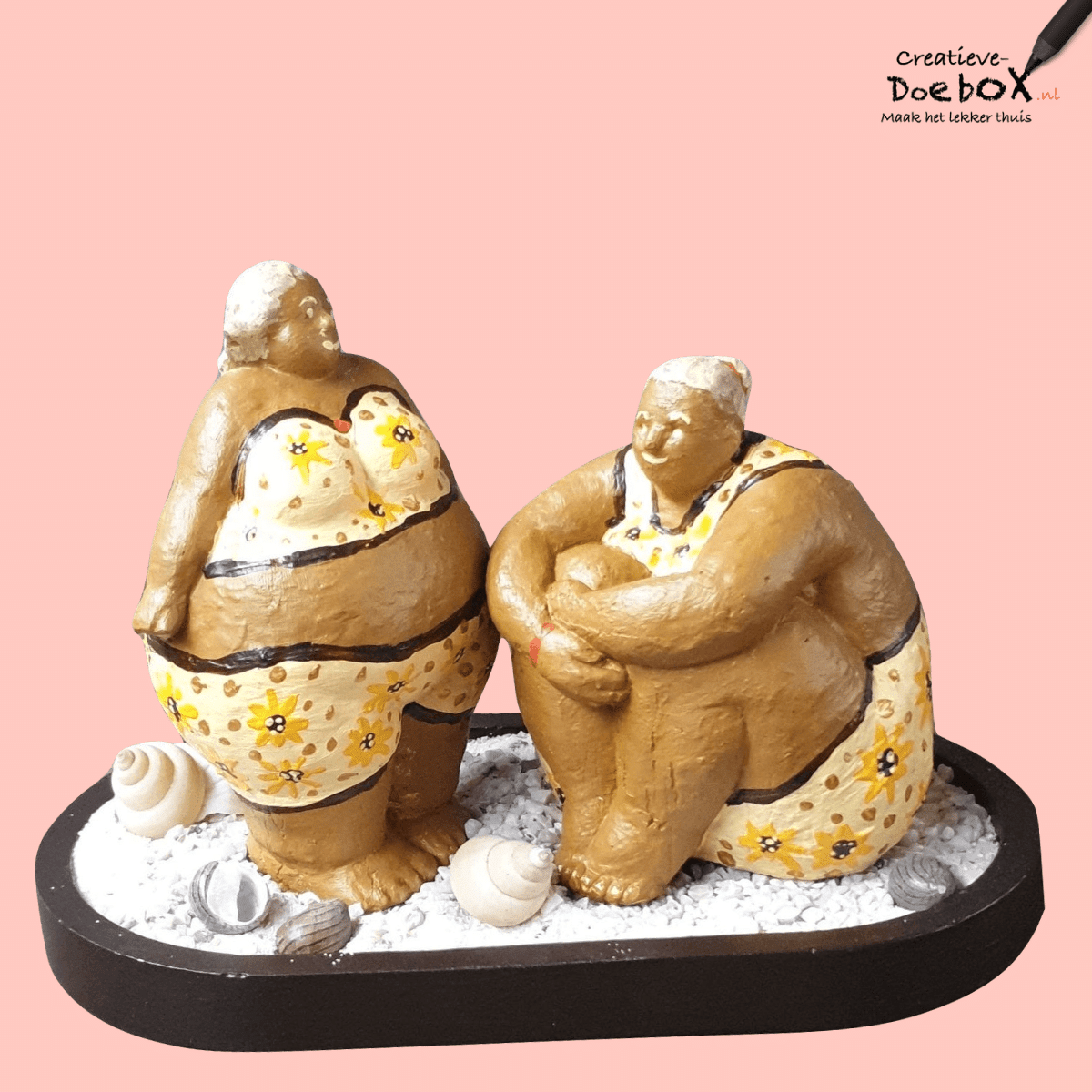 Dit zijn Beppie en Sjaantje en ze genieten met volle teugen op hun strandje. Ze zijn gemaakt van keramisch gips en zijn daardoor gemakkelijk te beschilderen. Ik heb een compleet pakket voor je gemaakt, je hoeft alleen je kleurkeuze op te geven. Met de handige kleurencirkel die ik erbij stop leer je ook zelf kleurtjes mengen. Omdat deze beeldjes vaak meerdere malen door mensen besteld worden heb ik sinds kort de penselen als vrije keuze toegevoegd. Daardoor is de basisprijs blijvend verlaagd.