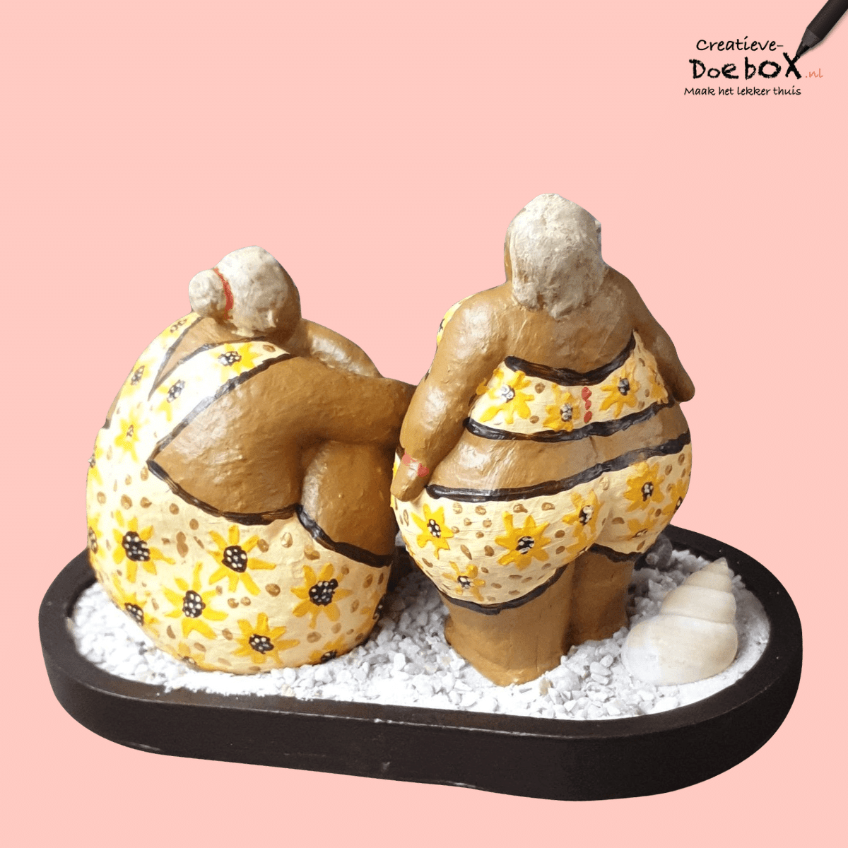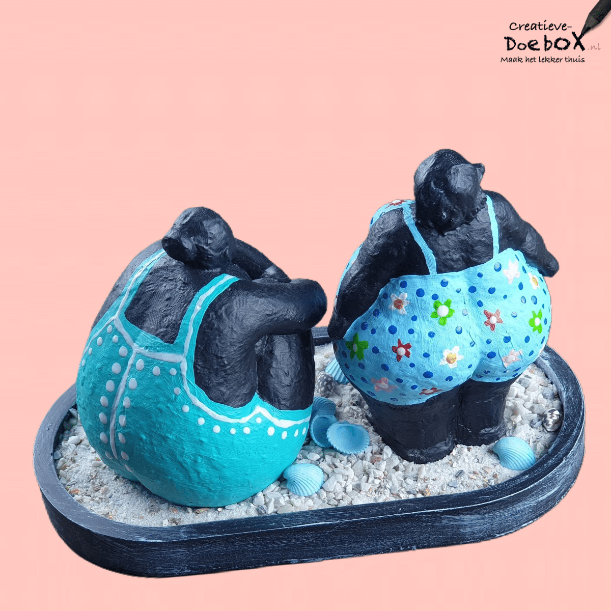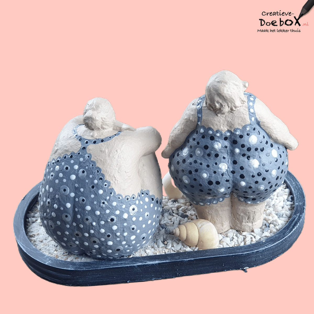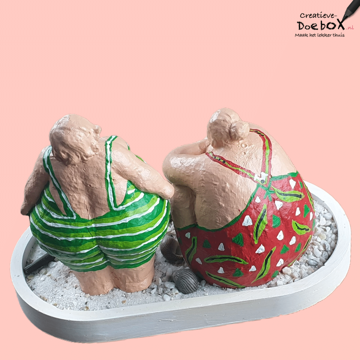 Dit zijn Beppie en Sjaantje en ze genieten met volle teugen op hun strandje. Ze zijn gemaakt van keramisch gips en zijn daardoor gemakkelijk te beschilderen. Ik heb een compleet pakket voor je gemaakt, je hoeft alleen je kleurkeuze op te geven. Met de handige kleurencirkel die ik erbij stop leer je ook zelf kleurtjes mengen. Omdat deze beeldjes vaak meerdere malen door mensen besteld worden heb ik sinds kort de penselen als vrije keuze toegevoegd. Daardoor is de basisprijs blijvend verlaagd.