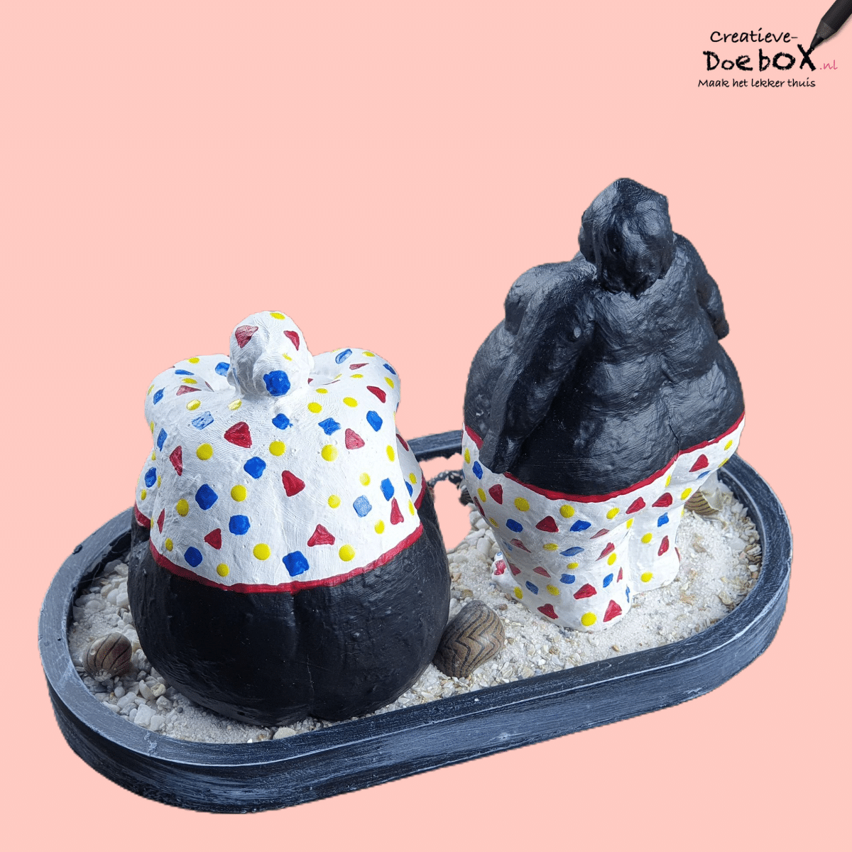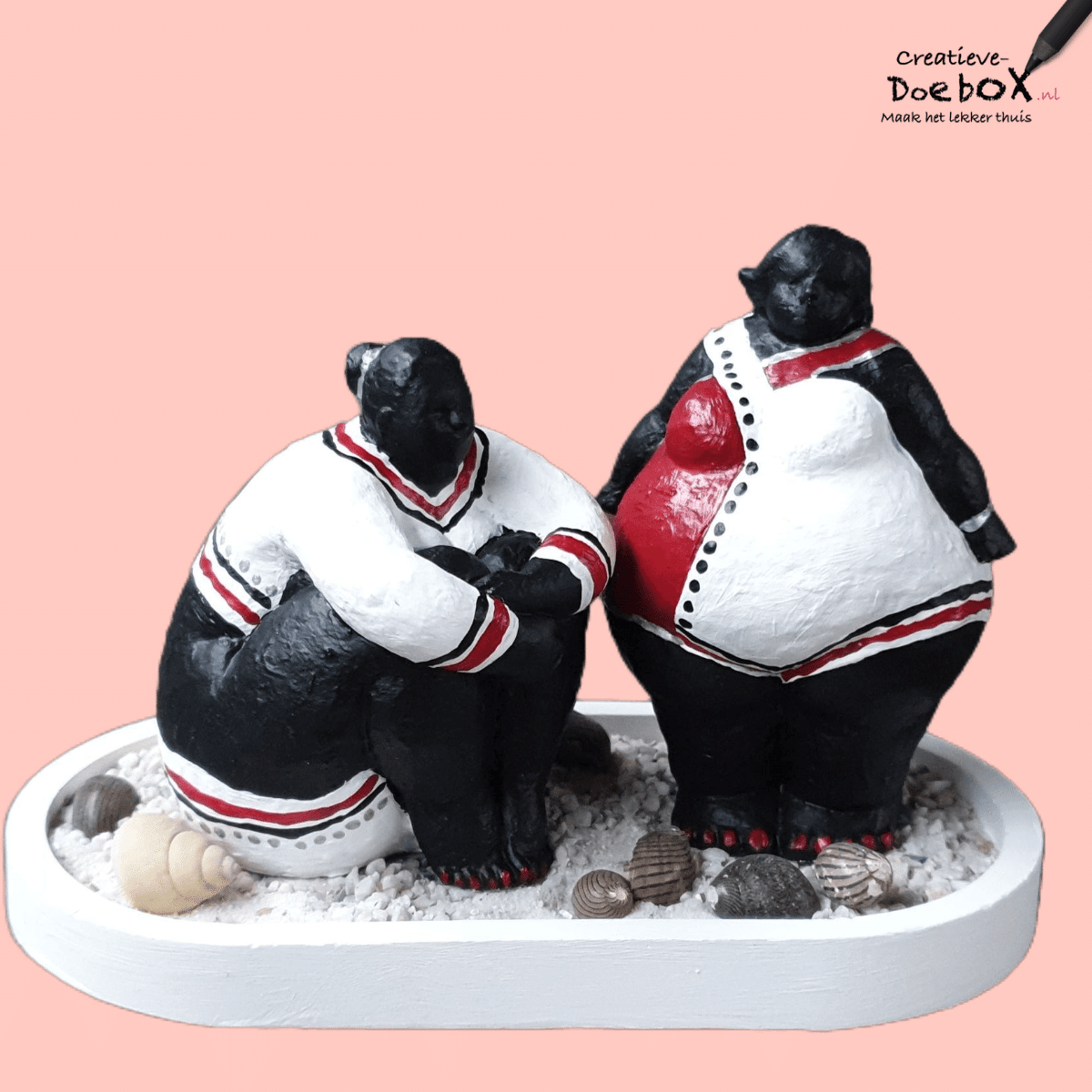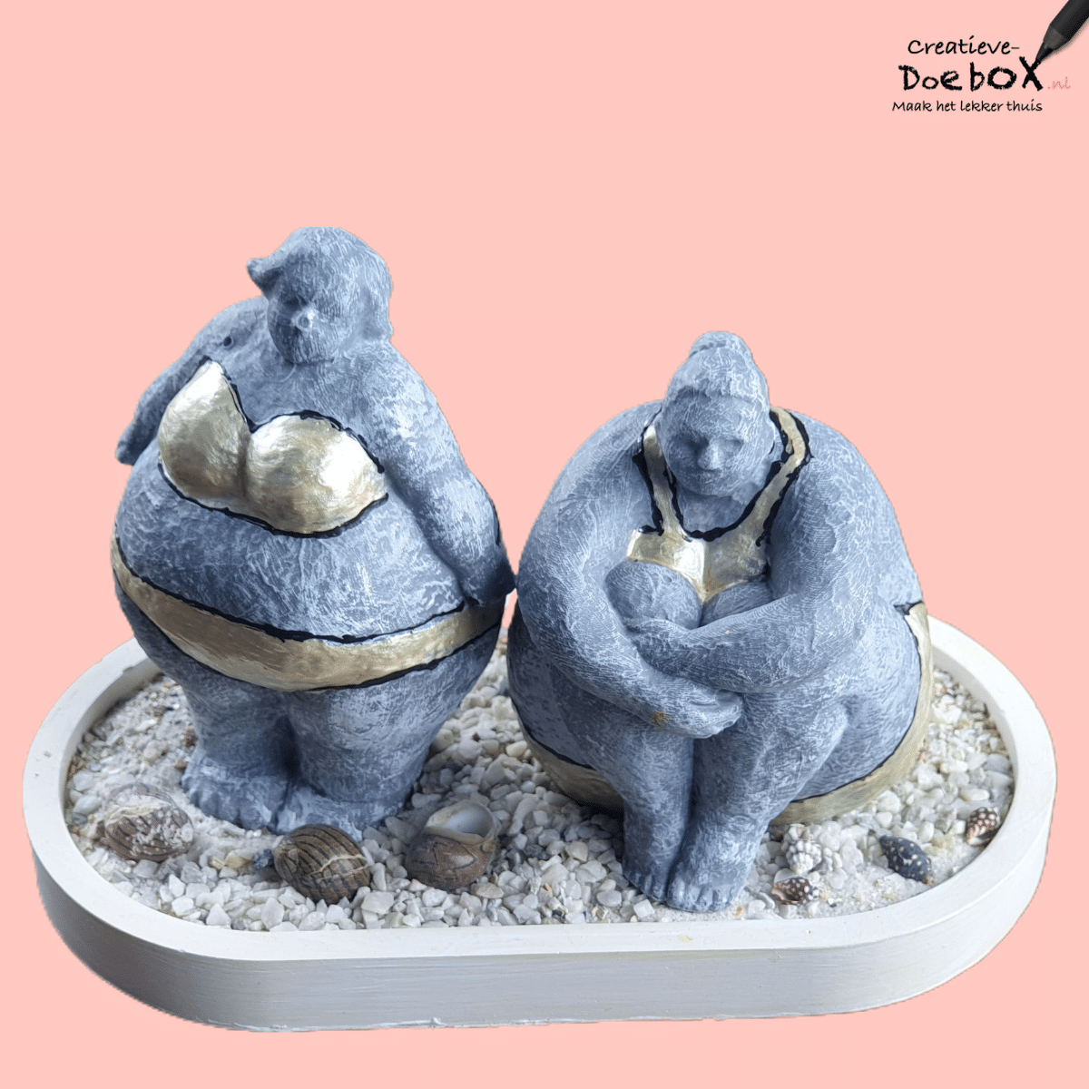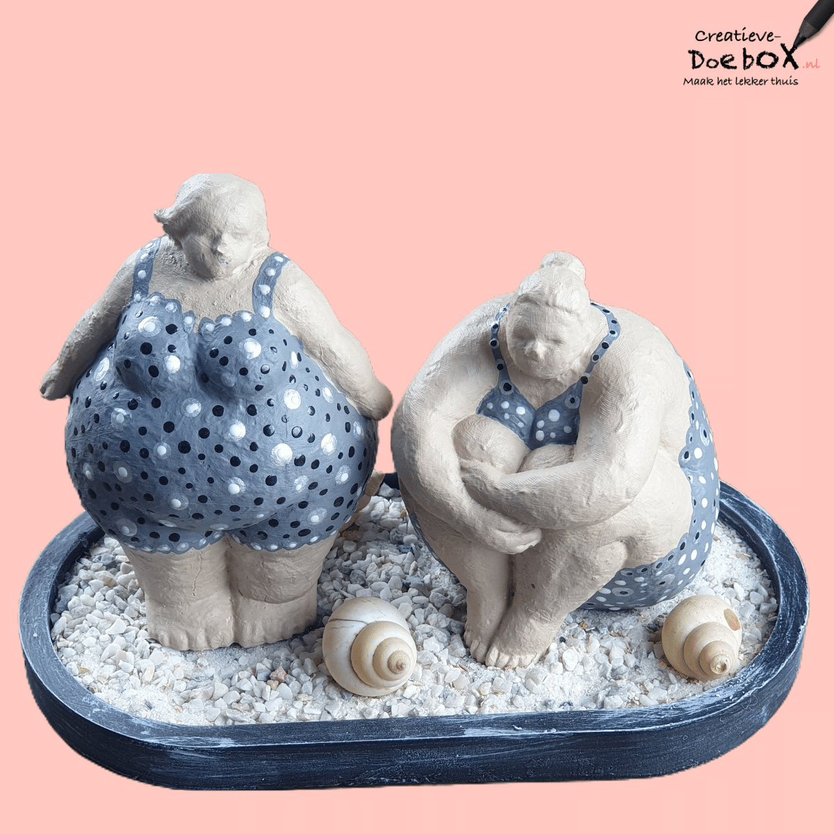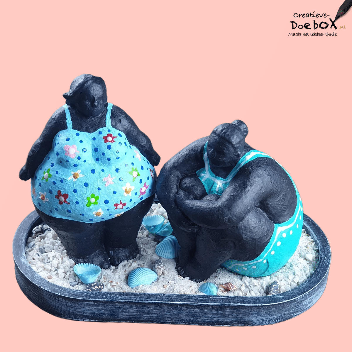 Dit zijn Beppie en Sjaantje en ze genieten met volle teugen op hun strandje. Ze zijn gemaakt van keramisch gips en zijn daardoor gemakkelijk te beschilderen. Ik heb een compleet pakket voor je gemaakt, je hoeft alleen je kleurkeuze op te geven. Met de handige kleurencirkel die ik erbij stop leer je ook zelf kleurtjes mengen. Omdat deze beeldjes vaak meerdere malen door mensen besteld worden heb ik sinds kort de penselen als vrije keuze toegevoegd. Daardoor is de basisprijs blijvend verlaagd.