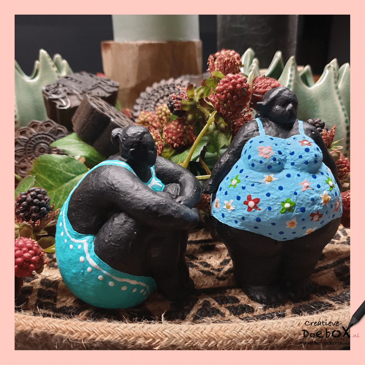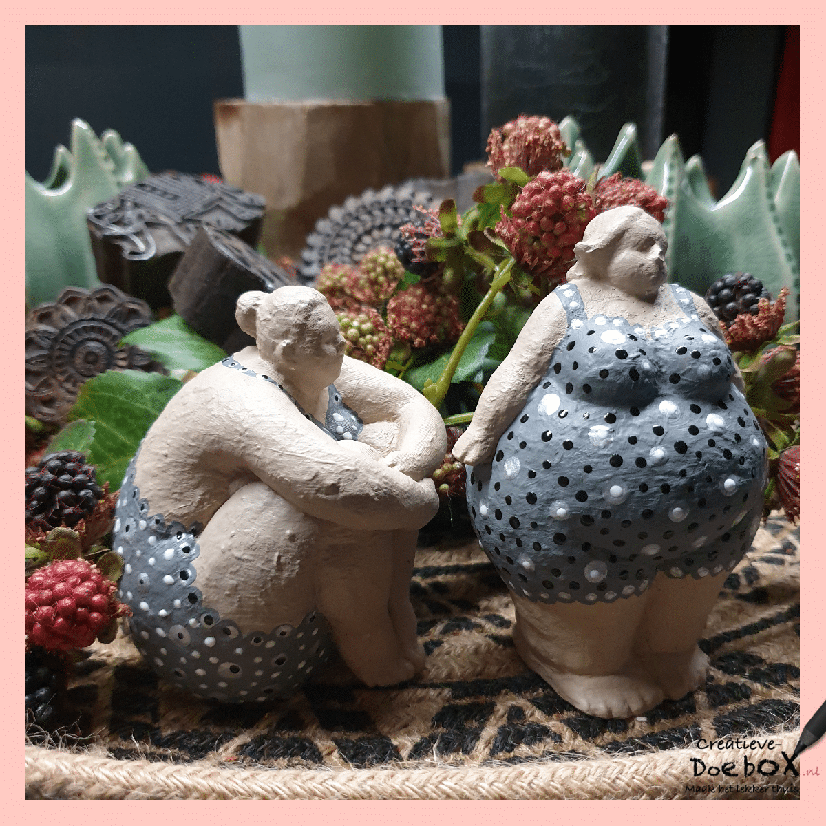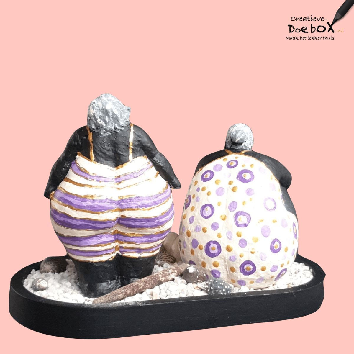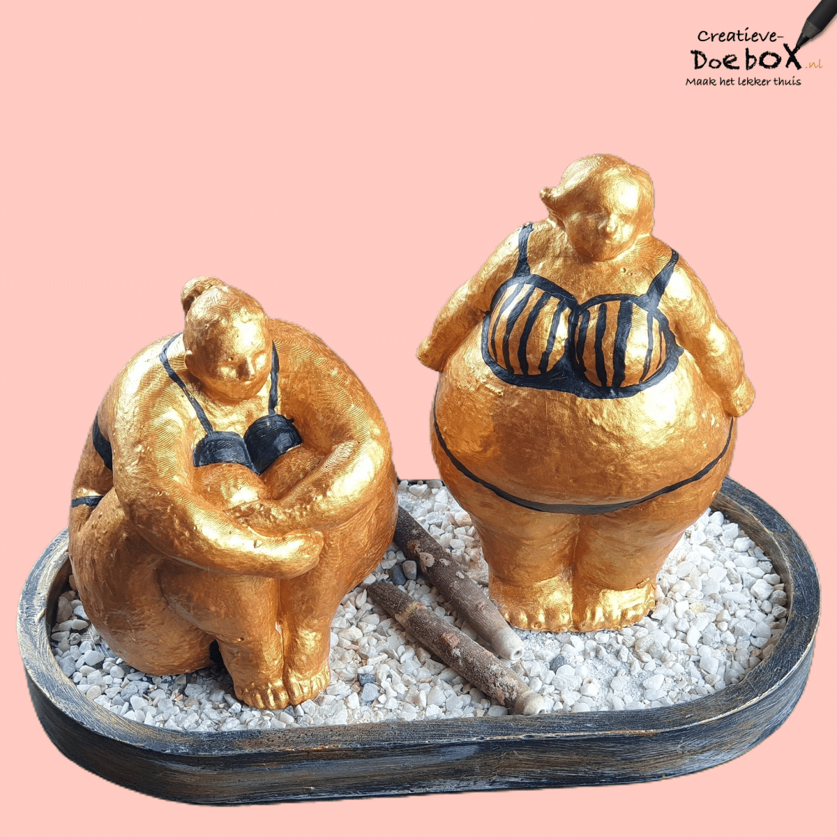 Dit zijn Beppie en Sjaantje en ze genieten met volle teugen op hun strandje. Ze zijn gemaakt van keramisch gips en zijn daardoor gemakkelijk te beschilderen. Ik heb een compleet pakket voor je gemaakt, je hoeft alleen je kleurkeuze op te geven. Met de handige kleurencirkel die ik erbij stop leer je ook zelf kleurtjes mengen. Omdat deze beeldjes vaak meerdere malen door mensen besteld worden heb ik sinds kort de penselen als vrije keuze toegevoegd. Daardoor is de basisprijs blijvend verlaagd.