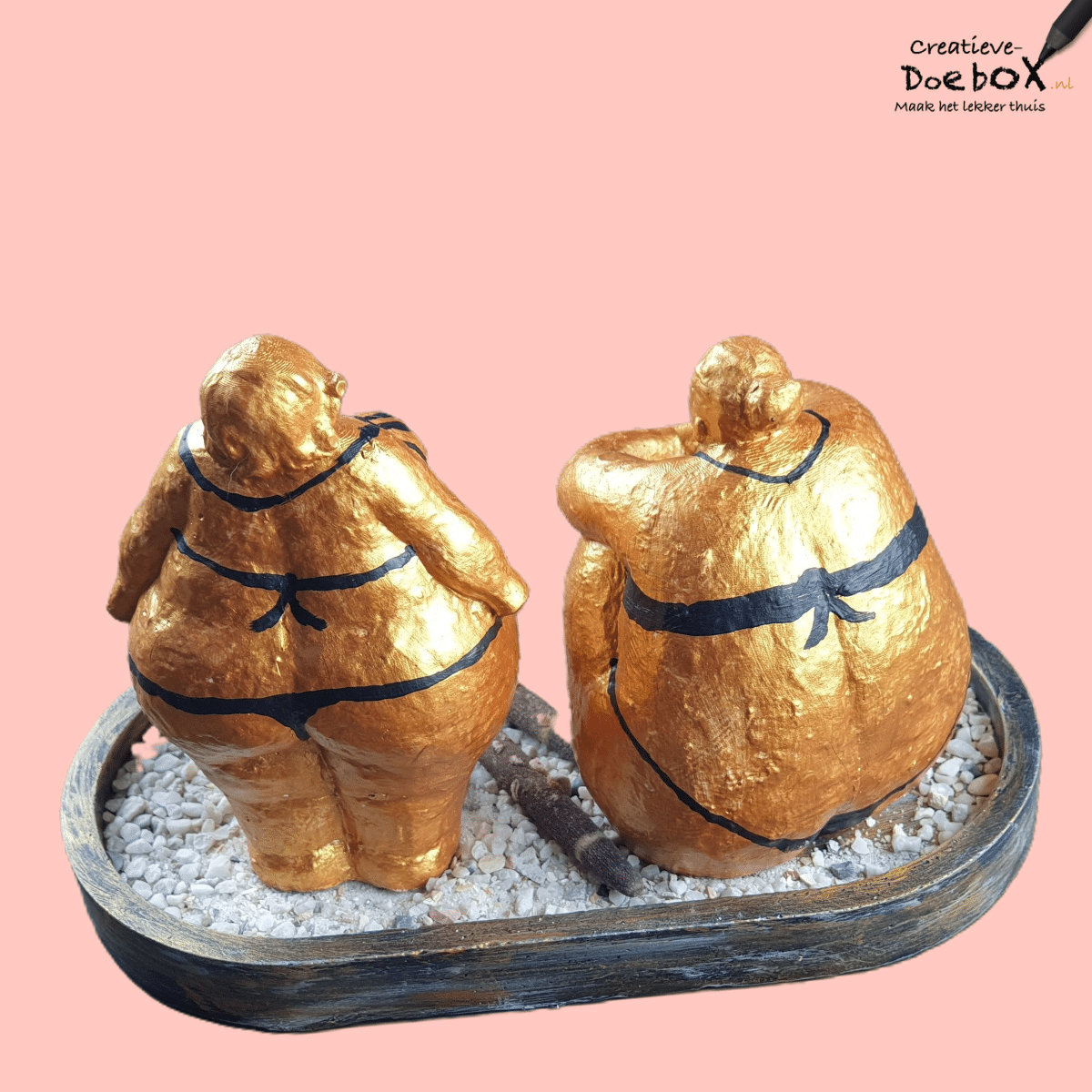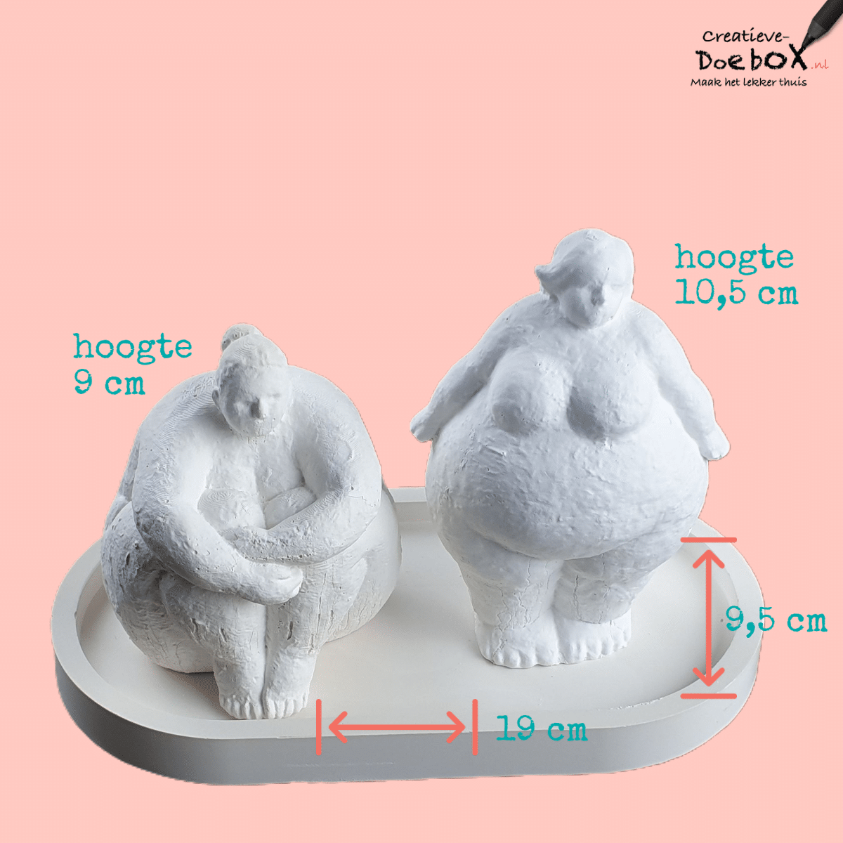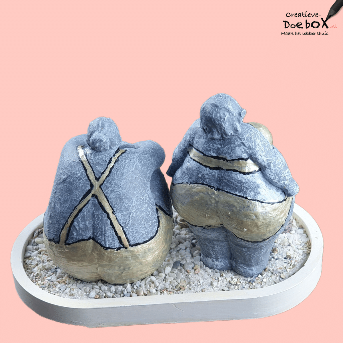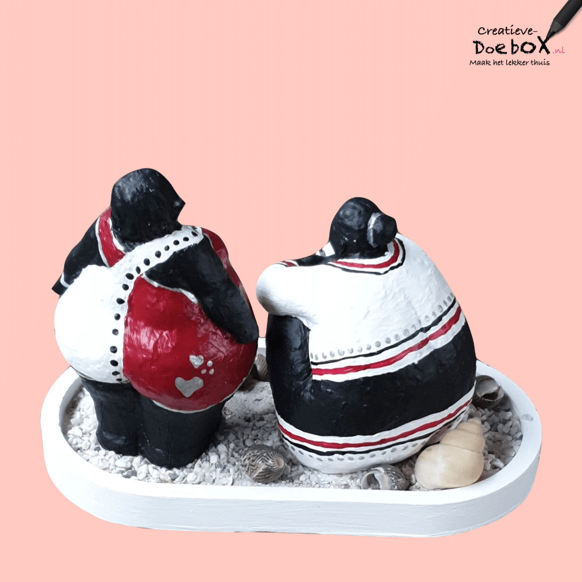 Dit zijn Beppie en Sjaantje en ze genieten met volle teugen op hun strandje. Ze zijn gemaakt van keramisch gips en zijn daardoor gemakkelijk te beschilderen. Ik heb een compleet pakket voor je gemaakt, je hoeft alleen je kleurkeuze op te geven. Met de handige kleurencirkel die ik erbij stop leer je ook zelf kleurtjes mengen. Omdat deze beeldjes vaak meerdere malen door mensen besteld worden heb ik sinds kort de penselen als vrije keuze toegevoegd. Daardoor is de basisprijs blijvend verlaagd.