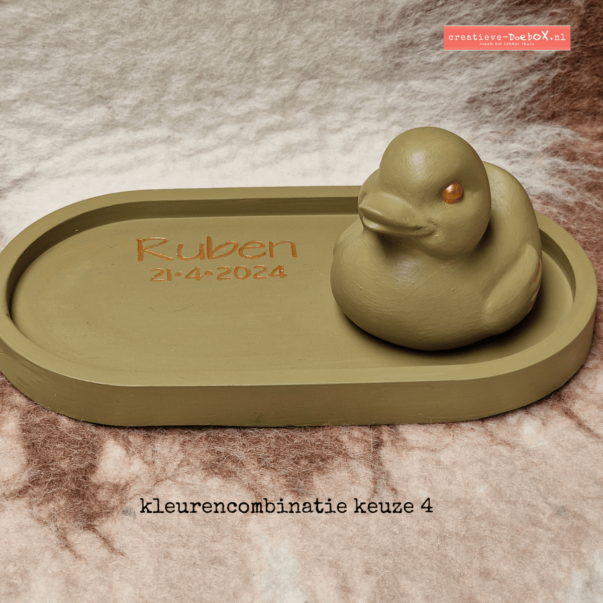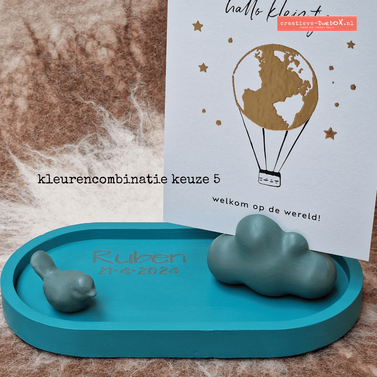 Een uniek en liefdevol cadeau om de komst van een kleintje te vieren! Dit gepersonaliseerde geboortesetje bestaat uit een schotel met daarin de naam en geboortedatum van de baby. (ligt verdiept in de bodem omdat ik de tekst in de mal maak voor ik giet). De basisprijs is € 12,50. Je maakt het setje helemaal naar wens door zelf een ornamentje te kiezen en te beslissen of je het door mij laat beschilderen of het liever zelf doet.