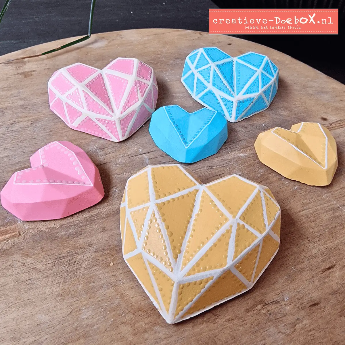 Deze geometrische hartjes combineren liefde met moderne kunst. Beschilder ze in je favoriete kleurtjes en decoreer ze verder met acrylstiften. Het is een idee, maak er wat moois van.