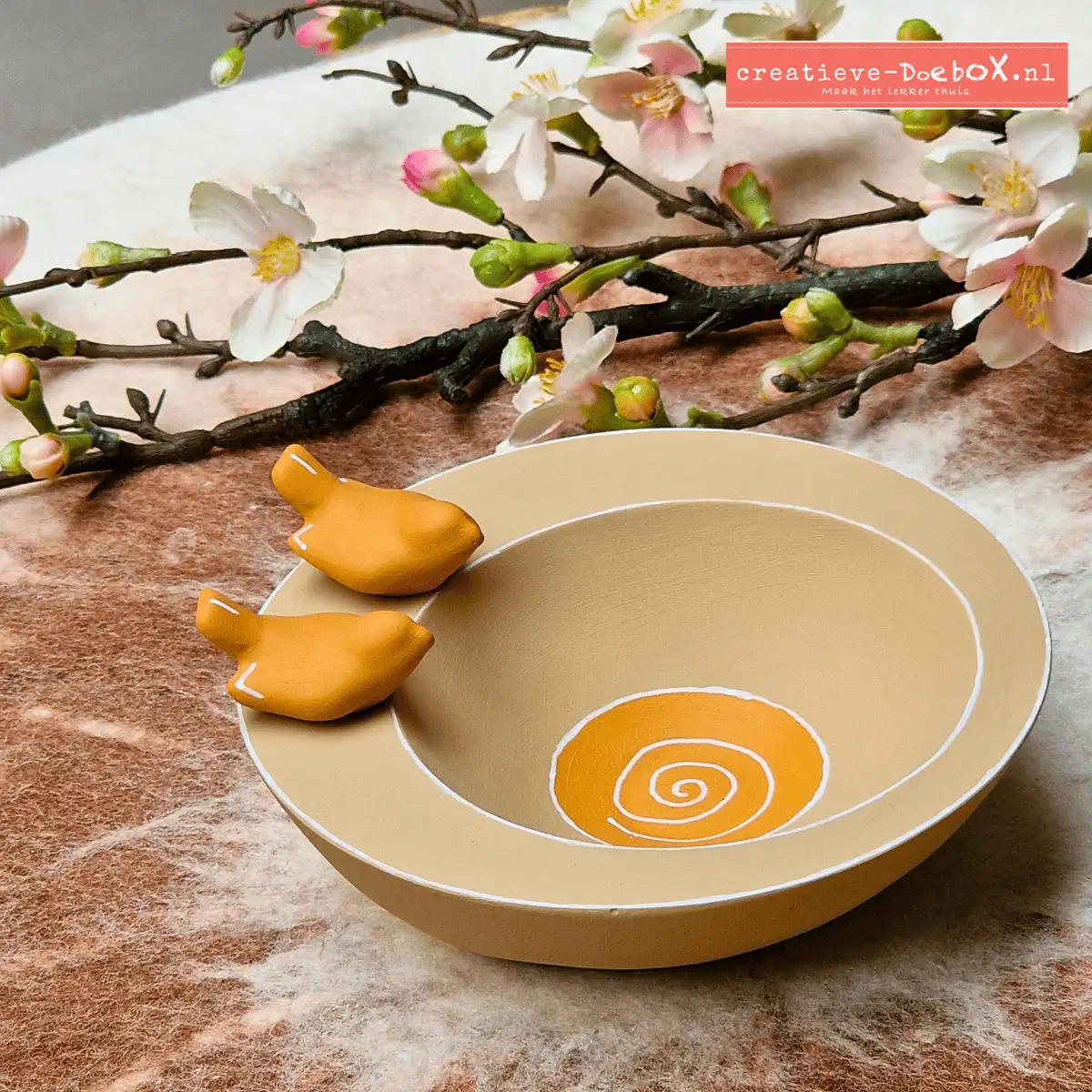 Deze prachtige ronde schaal met een speelse, asymmetrische rand is een echte blikvanger. Voeg daar twee schattige vogeltjes aan toe, en je hebt een decoratie die het voorjaarsgevoel perfect vangt.