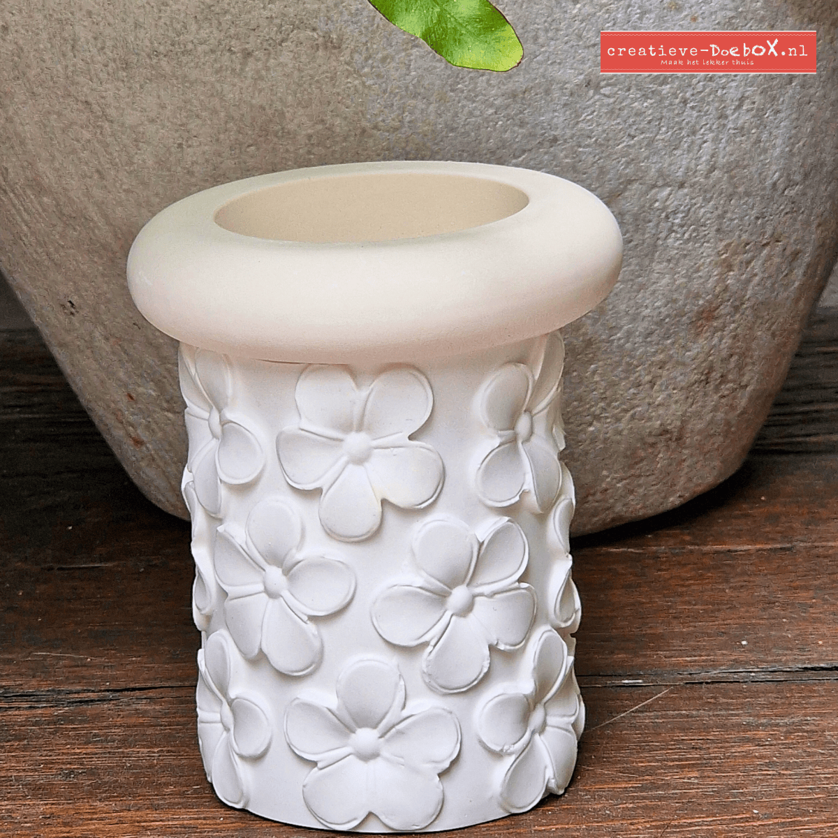 Deze cilinder is dit keer niet gevuld met tulpen, maar met een veld vol margrietjes! De details van de bloemetjes komen prachtig naar voren in het keramisch gips, en het strakke ronde schaaltje bovenop maakt het plaatje helemaal af. Mijn voorbeeld heb ik beschilderd in fris wit met een zonnig geel/groen kleurtje, maar misschien ga jij wel los met pasteltinten of een zomers kleurenpalet? Alles kan