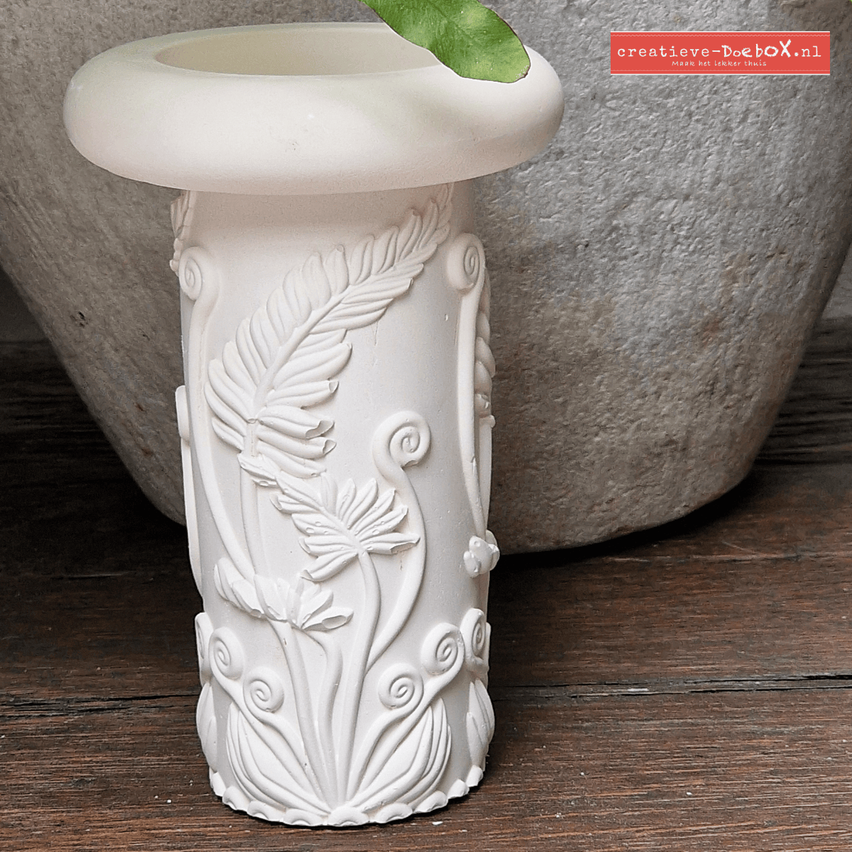 Deze cilinder is net wat hoger en smaller dan zijn soortgenoten, maar daardoor juist extra stijlvol. Met een hoogte van ongeveer 12 cm en een doorsnede van 5 cm is dit een perfecte sfeermaker voor een smal plankje of vensterbank. De fijne varenbladstructuur die in het keramisch gips gegoten is, komt prachtig tot leven zodra je de decoratie beschildert.