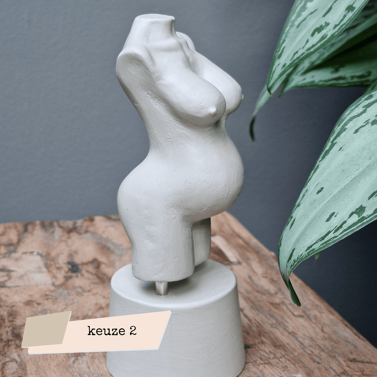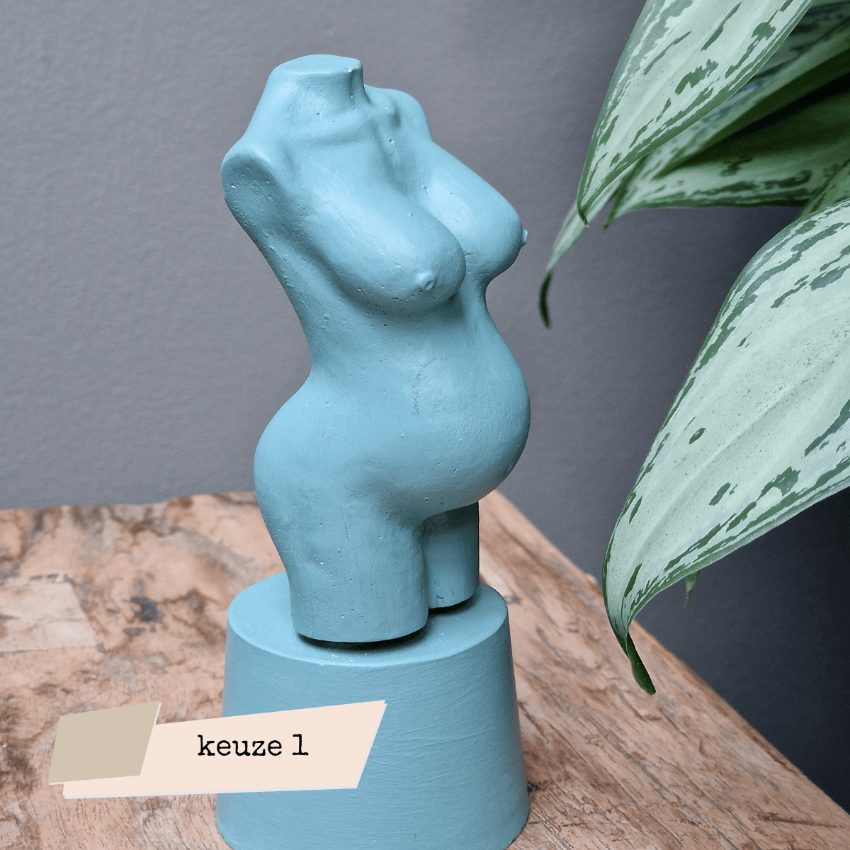 Na het bestellen ga ik je beeldje beschilderen. Ik heb de blanke beeldjes klaarstaan in mijn atelier, ik giet ze ook zelf. Omdat ik iets moois af wil leveren, vraag ik je een weekje geduld te hebben voor ik je torsje verstuur.
