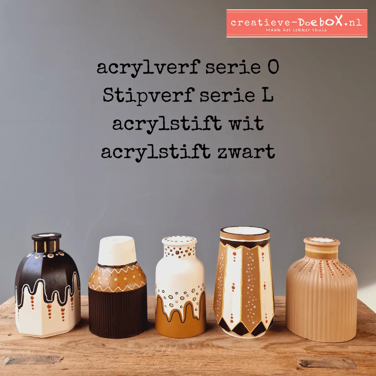 Ik heb deze vaasjes ook gedecoreerd met een acrylstift in wit en zwart. Deze heb ik niet opgenomen in het pakket, deze bestel je als optie. Het zijn maar enkele lijnen en is geen must om ze leuk te maken. Dat heb ik ook zo gedaan met de penselen. Vaak hebben jullie die al in huis.